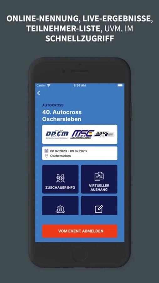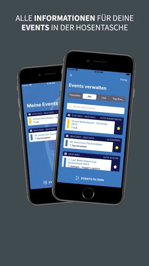 Über die Verwaltung der Events kann man den gewünschten Veranstaltungen der jeweiligen Disziplin z.B. Slalom, Rallye, Motocross, Rundstrecke, Kart-Slalom etc. folgen und wird via Push-Nachricht über den aktuellen Stand informiert.