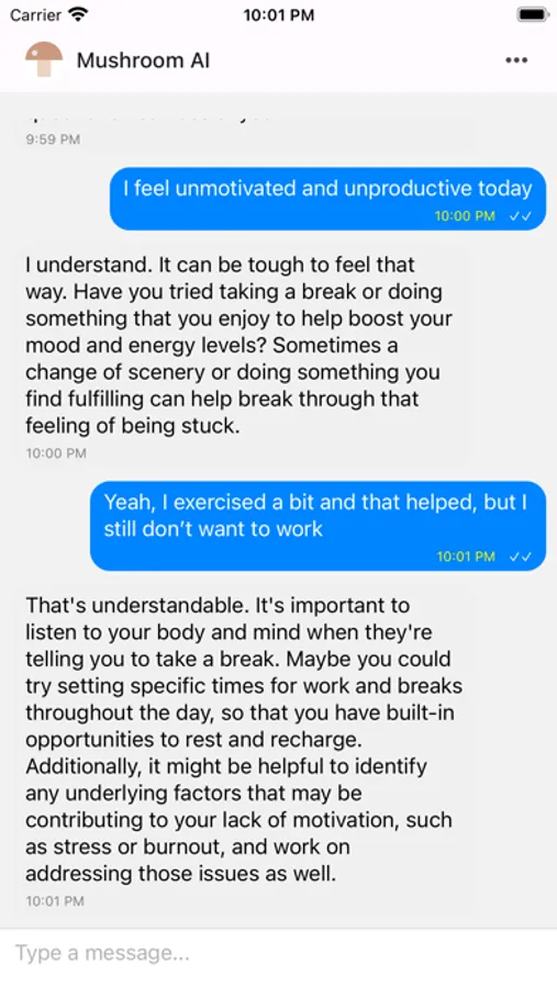 Mushroom app is an AI chatting app, powered by ChatGPT. It's is dedicated to being your trusted companion, offering a listening ear, personalized guidance, and support for your personal growth. We're committed to providing a safe space where you can talk freely and receive the support you need every step of the way.