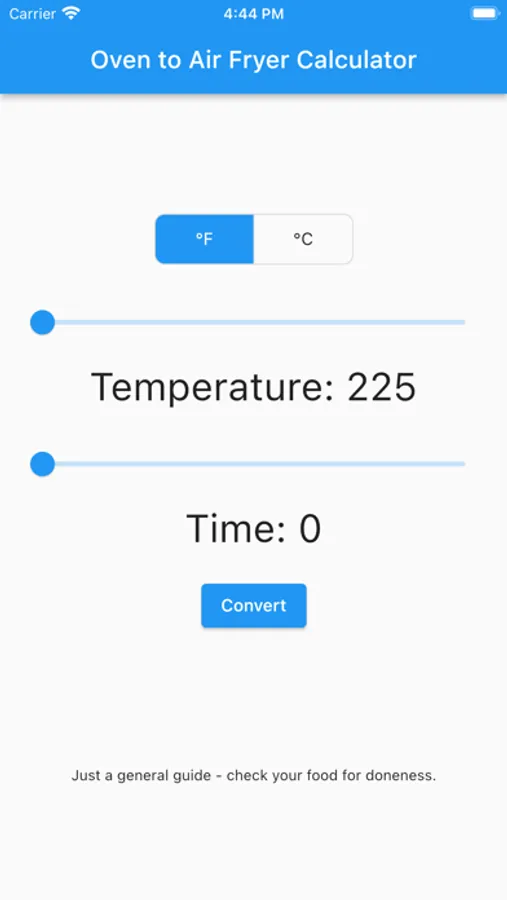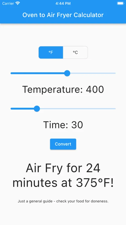 Convert oven instructions to air fryer. Toggle between Celsius or Fahrenheit, use sliders to choose temperature and time, then convert!