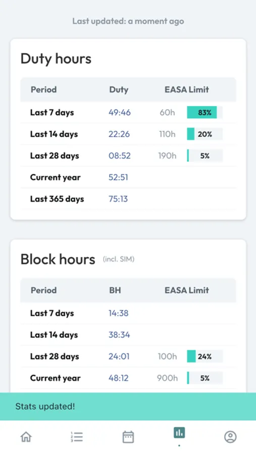 - Statistics and EASA limits (7, 14, 28 days, current month...)