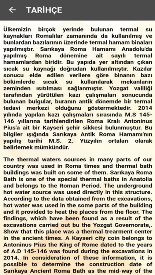 Bir örneği İngiltere'de bulunan ve M.S. 2. yüzyıl civarlarında yapıldığı tahmin edilen Yozgat İli Sarıkaya İlçesi'nde bulunan Tarihi Roma Hamamı tanıtım uygulaması