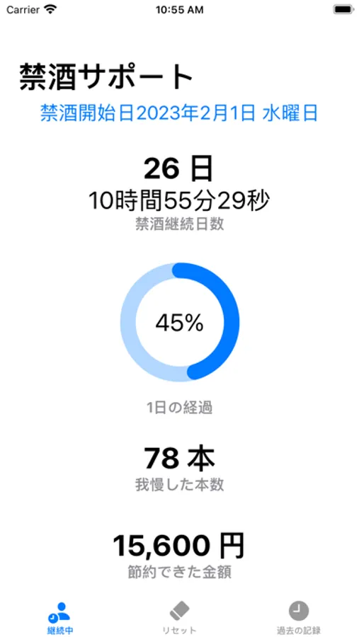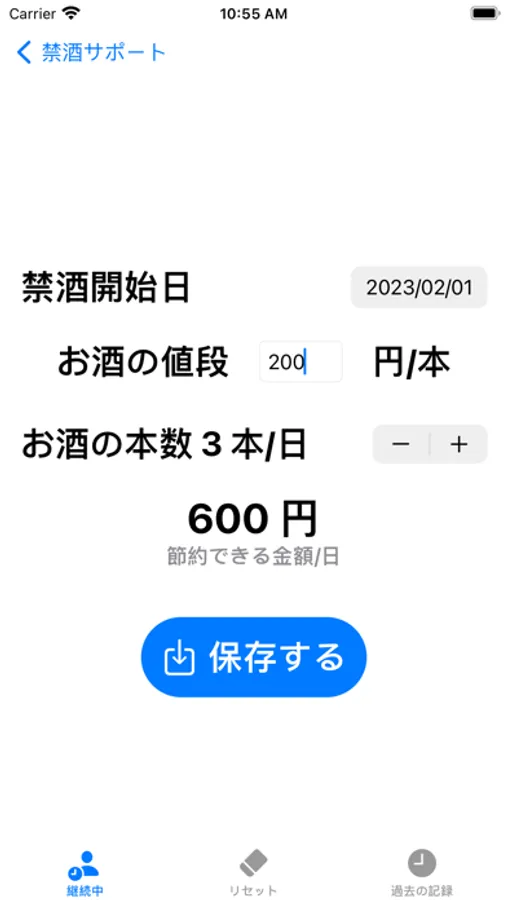 お酒の本数と値段を設定すると、1日の節約金額が表示されるアプリです。