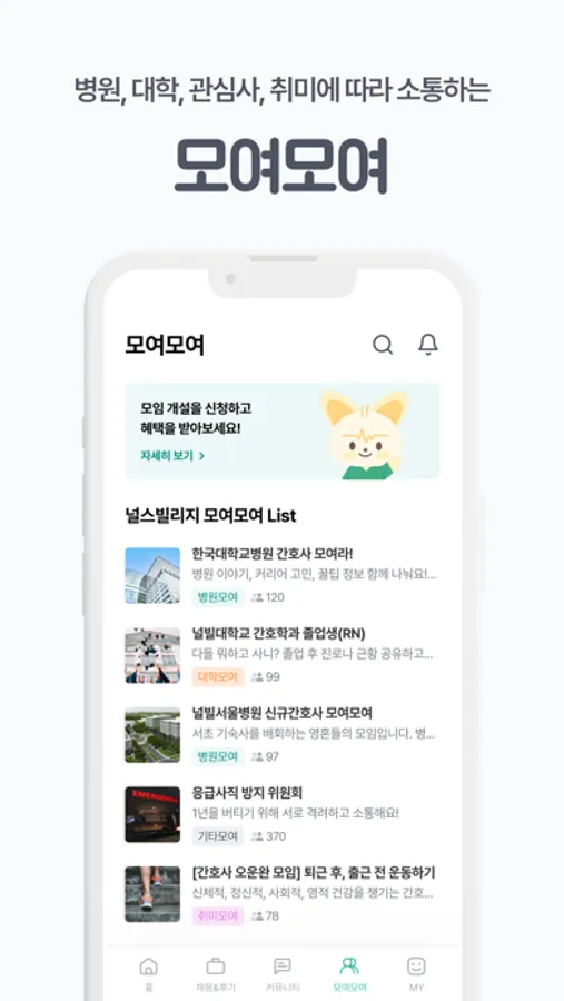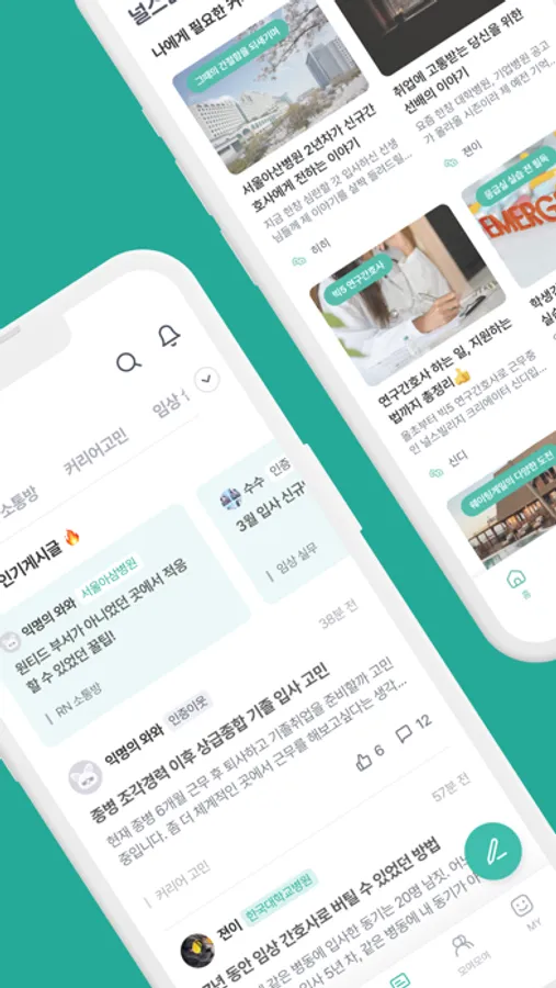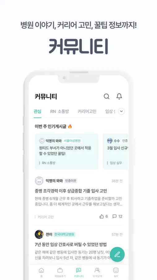 간호사 익명 커뮤니티, 병원별·대학별 모임, 전·현직 간호사 병원 근무 후기,맞춤형 채용공고 알림, 커리어 인사이트까지.