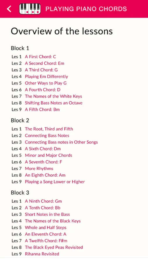 Each lesson will take about 15-30 minutes (depending on your skills of course). There are six blocks and there are nine lessons in each block. So in total there are more than fifty lessons. In each block you will learn new chords and new songs to play.