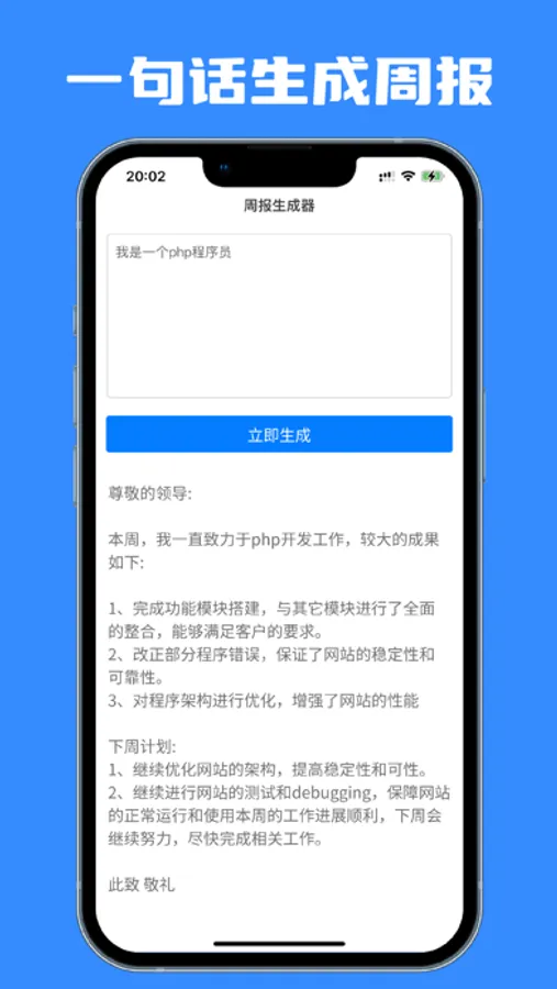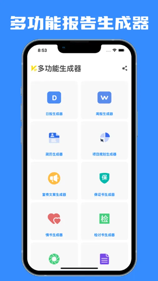 这个APP可以帮你智能生成周报、日报、简历、检讨书、情书、保证书、项目规划和宣传文案等常见报告,你只需要简单的表述几个报告的要点,即可快速生成完整详细的周报。