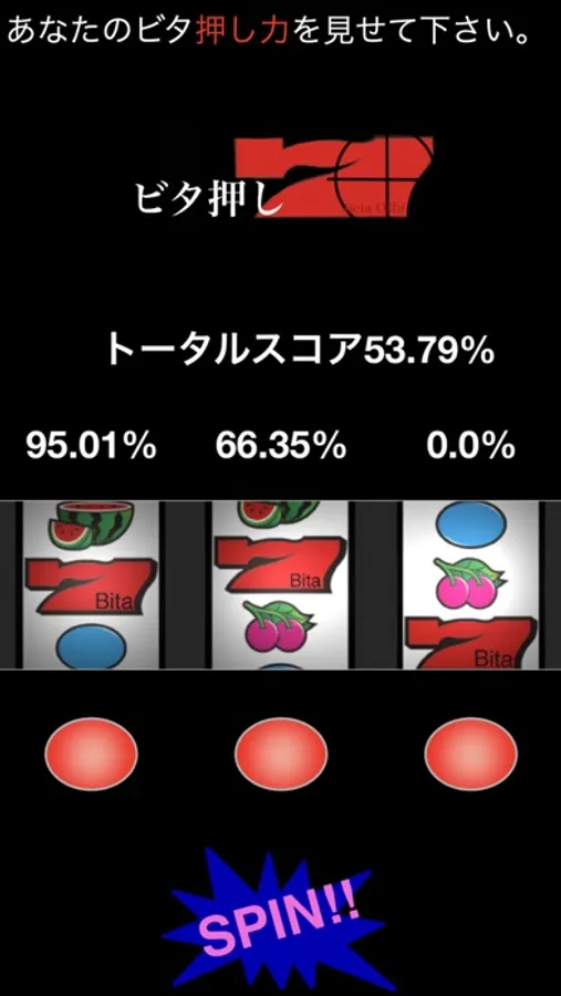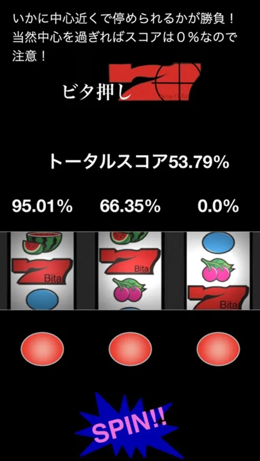 リール内の赤7を画面中央にストップさせ、中央にどれだけ近づけられるかを測るアプリです。