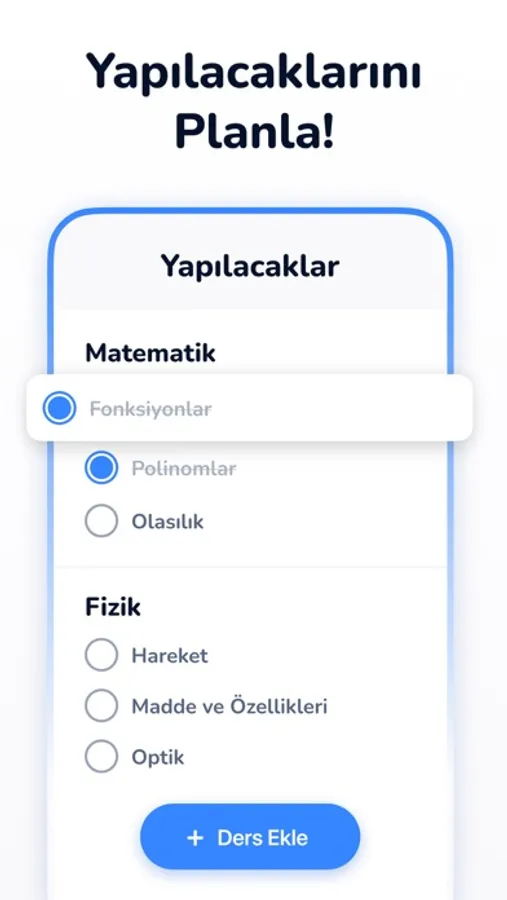 Düzenli ve planlı çalışmak sınavda başarılı olmak için gereken özelliklerin başında geliyor. Sade tasarımı ve kolay kullanımı ile “Yapılacaklar” özelliği günlerinizi planlamanızda en büyük yardımcınız olacak.