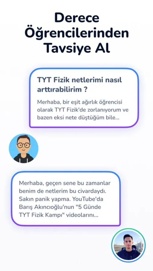 Aslında hepimiz çok farklı şekillerde sınava hazırlanıyor olsak da birçoğumuz benzer sıkıntılarla karşılaşıyor. Hemen hemen herkes “Keşke daha önce benim gibi bu problemi yaşamış bir derece öğrencisine bu problemin nasıl üstesinden geldiğini sorabilseydim” diye içinden geçirmiştir. FARABİ’nin “Dereceye Sor” özelliği sayesinde önceki yıllarda çok iyi sıralamalar yapmış derece öğrencilerine “rehberlik” ile ilgili sorularınızı sorabilecek ve sınav sürecinizde asla yalnız yürümeyeceksiniz.