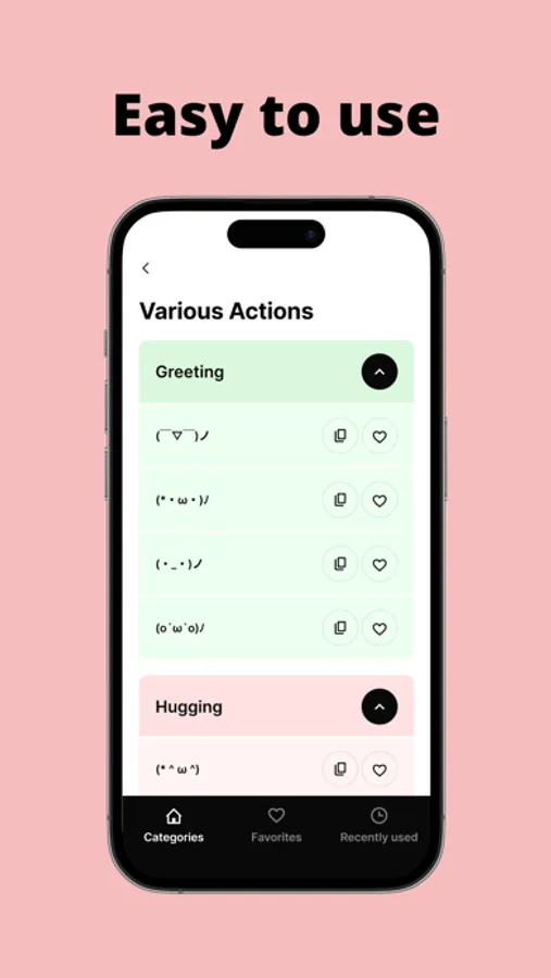 Each kaomoji has two buttons - "Copy" and "Add to Favorites". Clicking the "Copy" button copies the kaomoji to the clipboard, making it available for use in text messages, social networks, and other apps. All copied kaomojis can be found in the Recently Used screen.