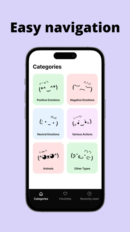 The app includes three main screens - Home, Favorites, and Recently Used - that can be accessed easily using the Bottom Navigation menu. The Home screen contains a vast collection of kaomojis grouped into categories and subcategories, making it easier for users to navigate and search.
