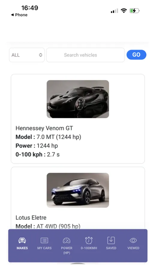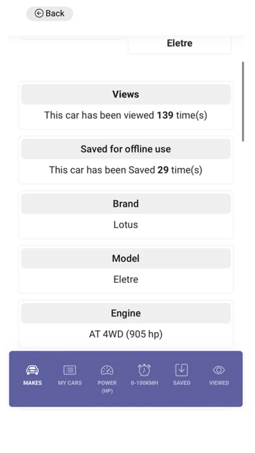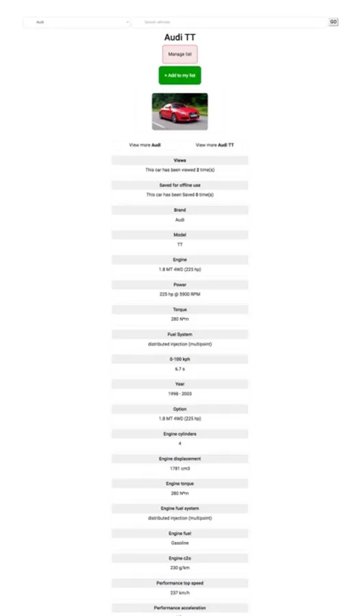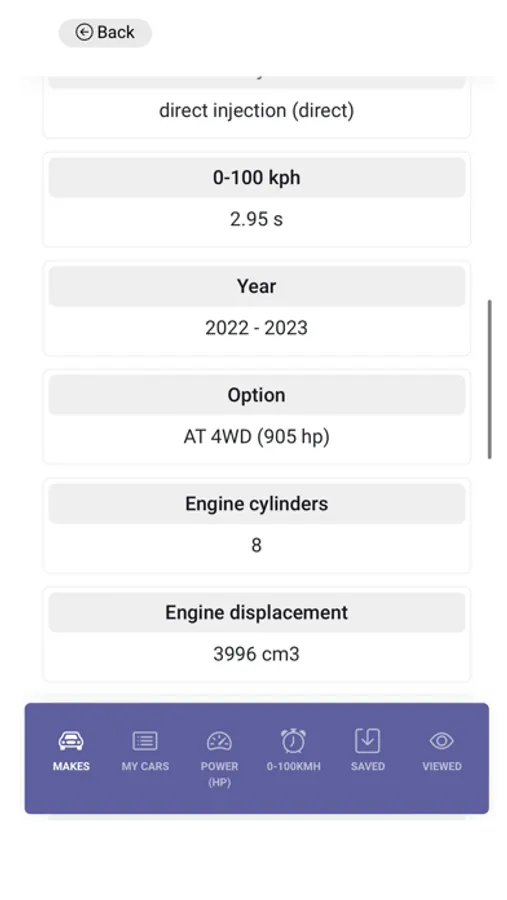 Data... Such as Horsepower , 0-100kph, fuel type, Engine cylinders and a lot more.