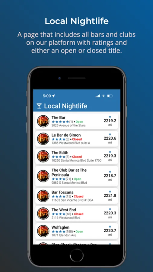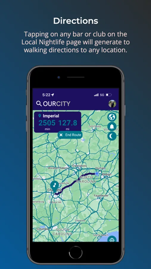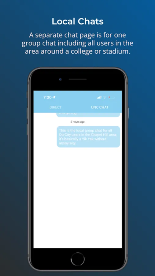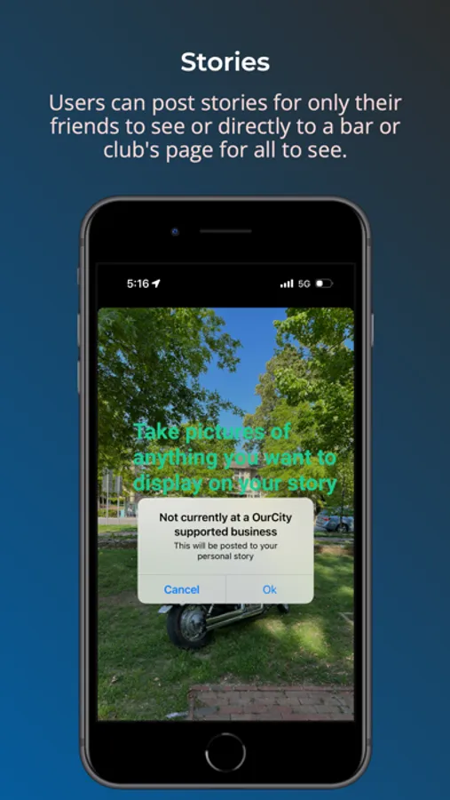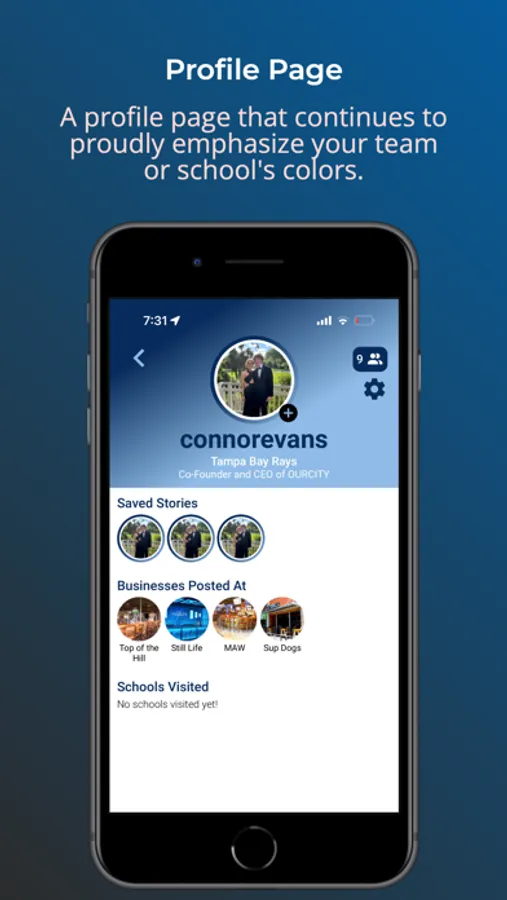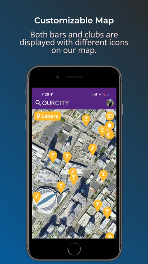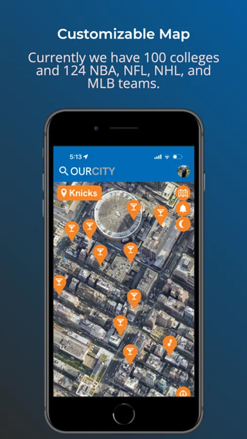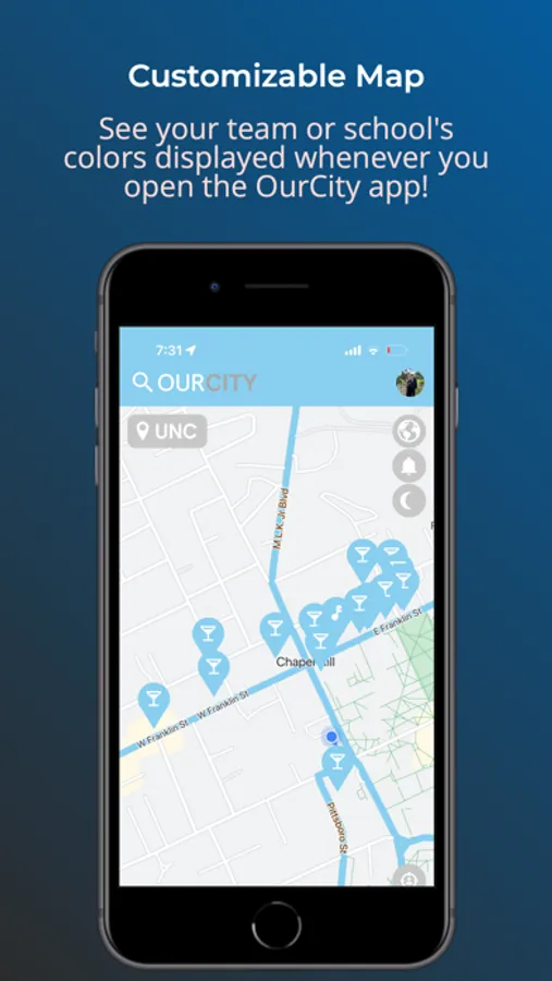 OURCITY provides users with an interactive platform where listings of local bars and nightclubs in college towns or professional sports teams' cities are displayed on an interactive and user-customizable map. Upon scrolling to a different page from OURCITY’s map, users have the ability to enter a promotional posts page, a ratings and reviews page, a messaging page, or their user profile. Users also have the ability to effortlessly switch between schools that OURCITY supports; this list of schools and teams will be constantly expanding through software updates.