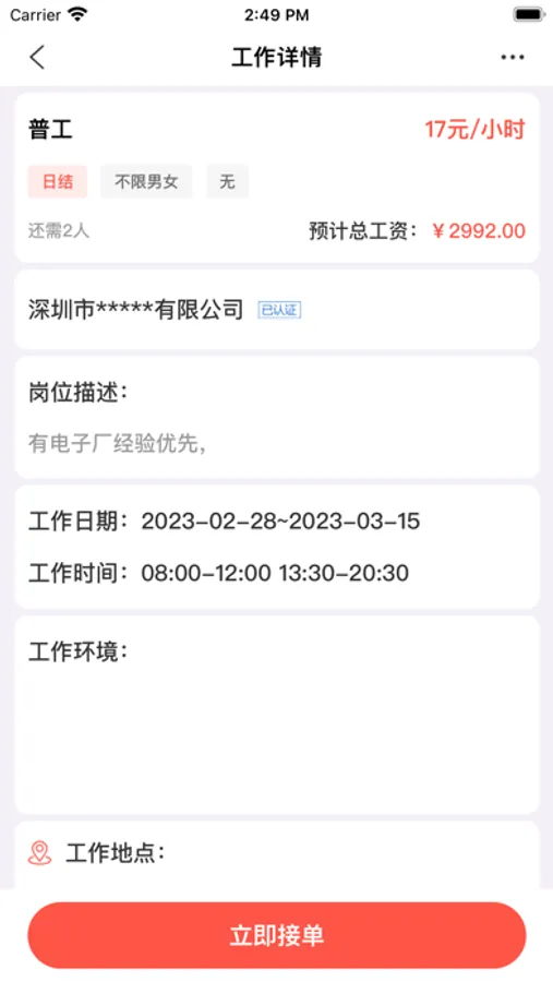 工时猫一站式灵活用工服务平台是一款专注于工厂招聘的APP软件,旨在帮助广大工厂企业快速招聘大量工人,帮助工厂工人朋友快速找到工作,工时猫APP独特的平台模式,没有传统劳务中介,招聘信息来源于工厂直接招聘直接发布,高时新,真正保障工厂求职者利益,工时猫招聘信息目前已涵盖工厂小时工、日结、月结、长期固定工等多种类型的工作,能满足工厂求职朋友全部工作需求,工厂朋友可自由选择平台内中意的工作,还有专业平台客服免费对接入职流程,帮助办理入职,免除工厂朋友后顾之忧!工厂招聘,工人找工作,推荐工时猫