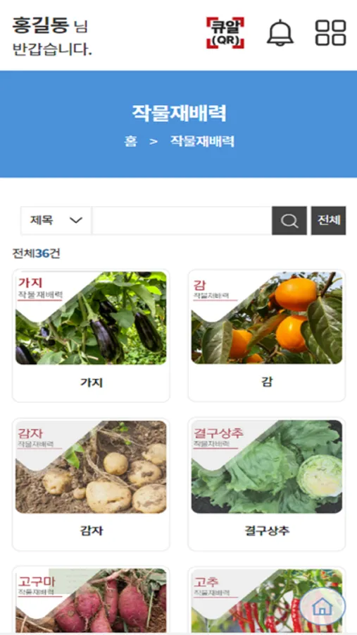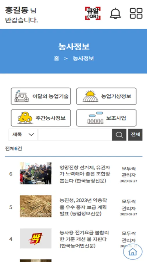 ‘이달의 농업기술’, ‘농업기상정보’, ‘주간농사정보’, ‘보조사업’에 관한 정보를 확인할 수 있고, 농업관련 최신 정보를 확인할 수 있습니다.