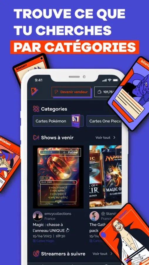 Blisterr c’est ta nouvelle marketplace où tout se passe en live. C’est ici que tu peux rejoindre une communauté de collectionneurs.ses passionné.e.s par la pop culture, c’est ici que tu peux chiller devant des lives divertissants, c’est ici que tu peux enchérir pour obtenir l’item de tes rêves, c’est aussi ici que tu peux régaler tes spectateurs en leur proposant des pièces uniques.