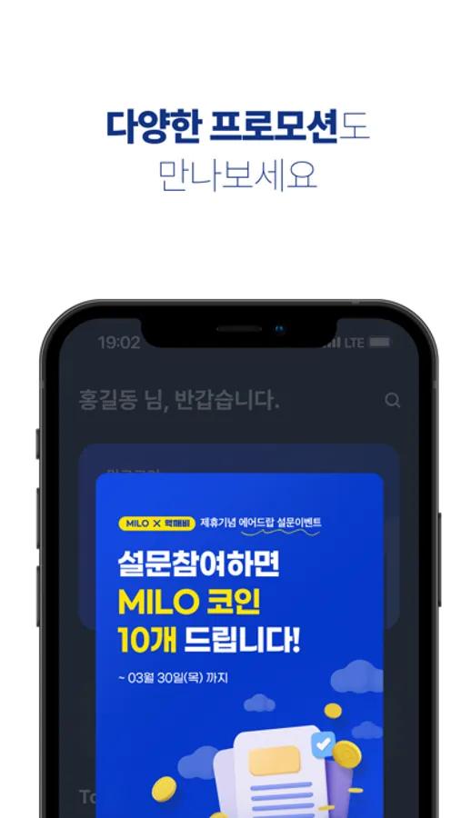 - 다채로운 앱 경험을 위한 설문조사, MILO 몰, 커뮤니티 등 다양한 혜택을 제공해 드립니다.
