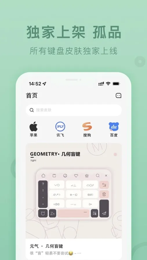 手机键盘输入法自带皮肤普通没有创意,而元气键盘皮肤出品的各种绝美皮肤主题让你的手机输入法不再单调,完美适配 苹果手机各种机型和iOS系统,主题商品涵盖各种风格的皮肤,一键定制个性化的输入法键盘壁纸。
