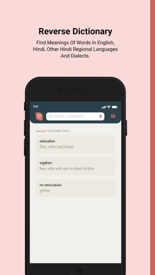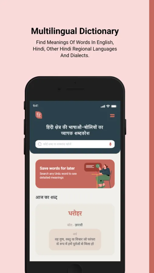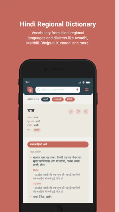 Hindwi Hindi Dictionary App has a vast collection of words from Hindi, other Hindi regional languages and dialects with detailed meanings and definitions. It includes word origin, correct pronunciation, usage,