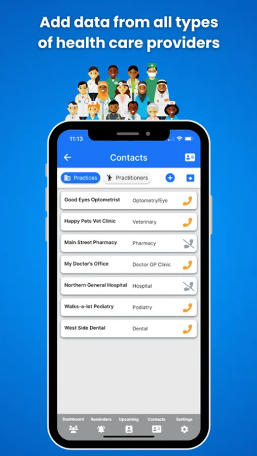 Be in control of and track your own medical and health record. Various doctor's clinic visits; no problem. Dental, optometrist, physio and other practice visits; included. Moving practices, cities or even countries; no problem. You enter your data, and it stays with you, no matter where you are.