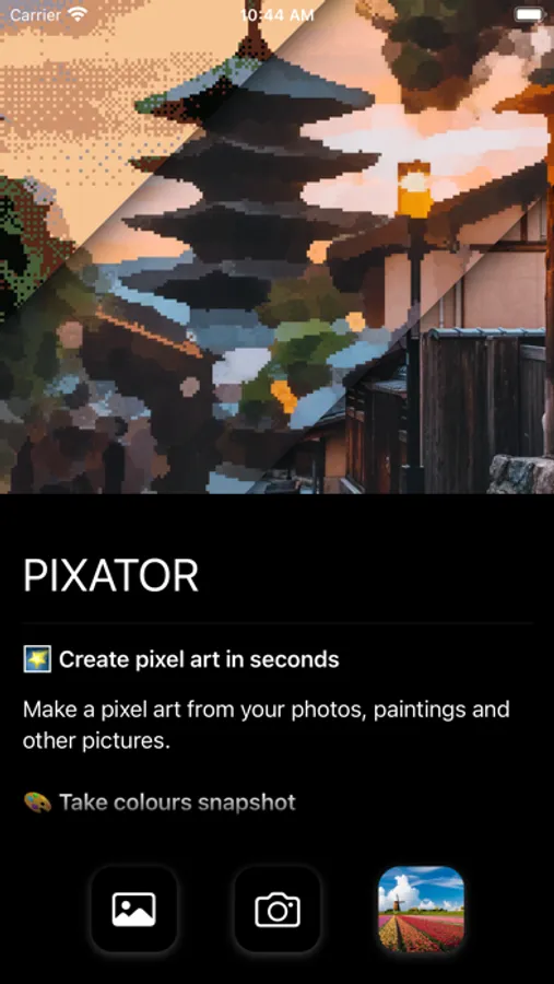 Pixator is an experimental app that should simplify making pixel art a lot. You can use it for styling your photos or preparing a foundation for your future artworks. Though the idea sounds super simple, we're thinking to develop it based on our users' thoughts and feedback.