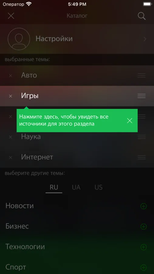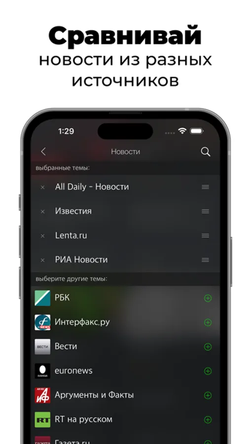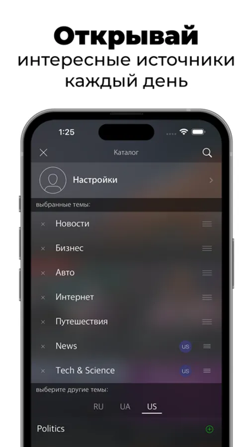 - возможность редактировать ленту новостей, добавляя и удаляя категории и источники. Вы можете подключить как глобальные, так и региональные СМИ;