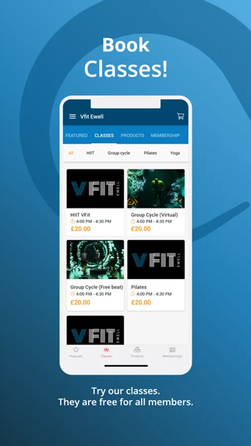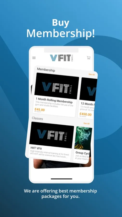Vfit Ewell app features include access control (entering Vfit), class bookins, membership bookings, updates on club information