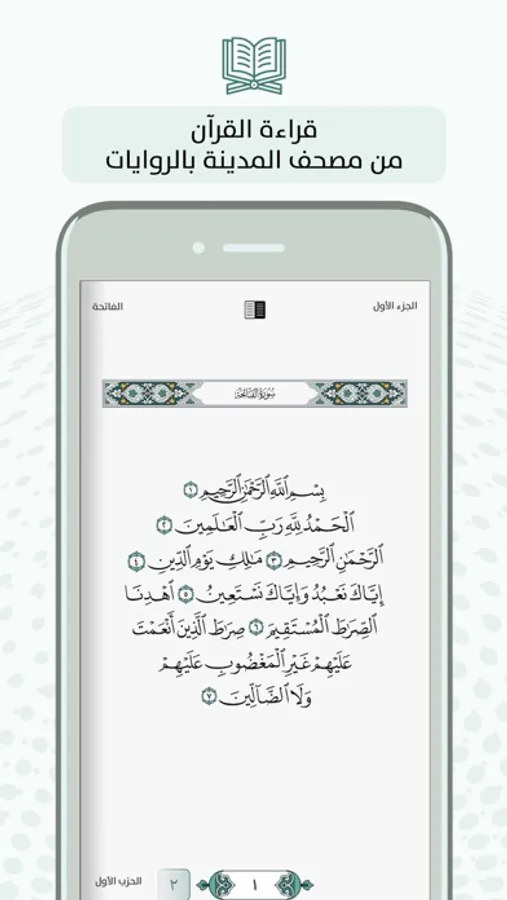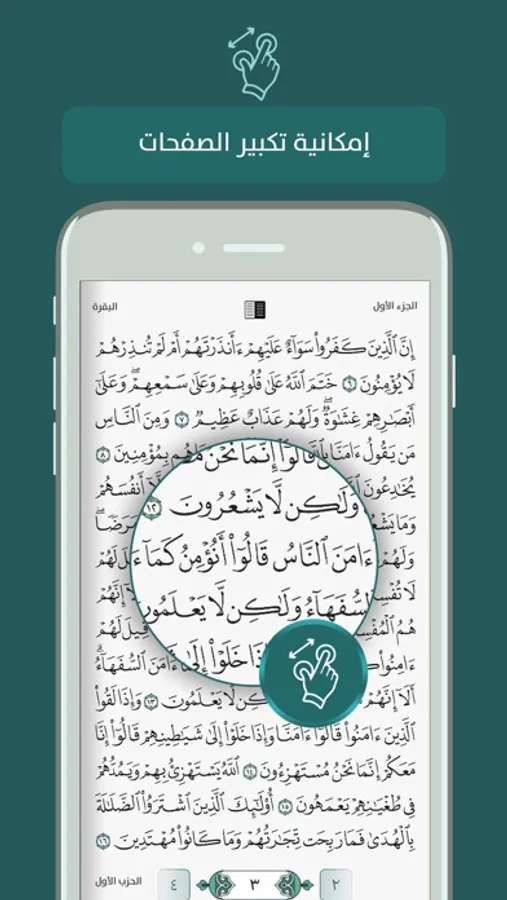 1- عرض المصحف: تصميم قرآني بالخط العثماني بألوانٍ هادئة مريحة للعين مع إمكانية عرض صفحتين على الأجهزة اللوحية والآيباد، وإمكانية تكبير الصفحة.
