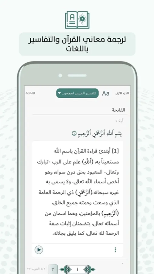 يستطيع المستخدم من خلاله تلاوة وحفظ القرآن الكريم، والاستماع إلى تلاوته بصوت عدد من مشاهير القُراء،كما يتيح له تصفح وقراءة التفاسير، بالإضافة إلى إمكانية الاطلاع والبحث في ترجمات معاني القرآن الكريم بلغات متعددة من أوثق الترجمات.