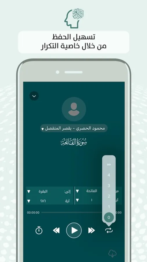 2- خاصية التحفيظ: المساعدة في تحفيظ القرآن الكريم من خلال خاصية تكرار آية أو عدد من الآيات.