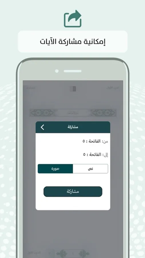 7- مشاركة المحتوى: إمكانية مشاركة الآيات نصيا، ومشاركة التفسير والترجمة.