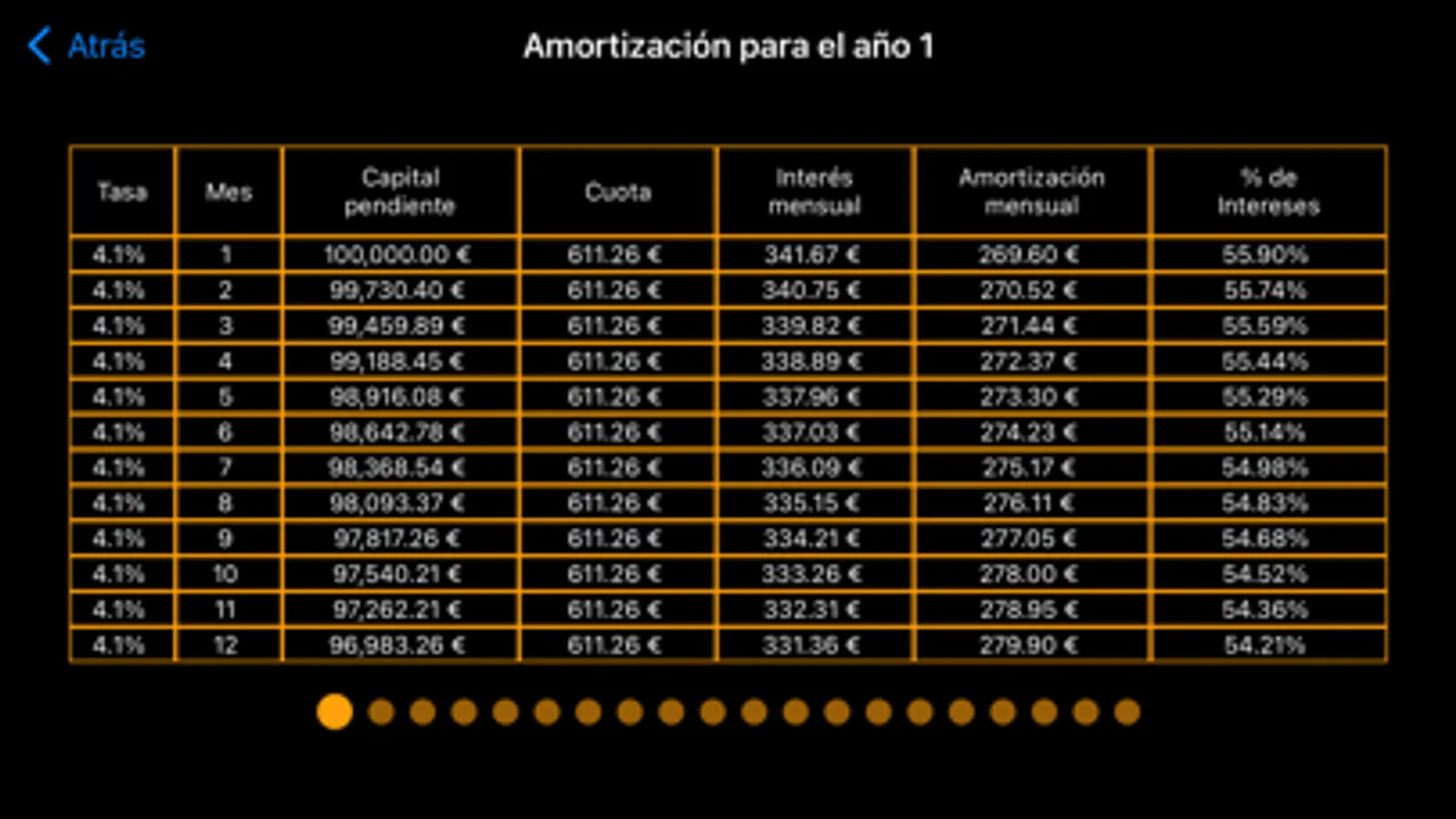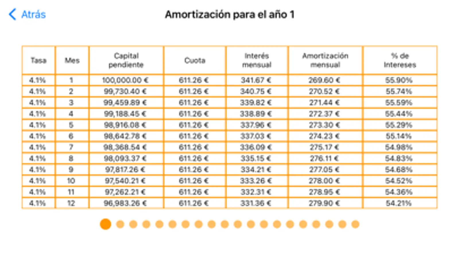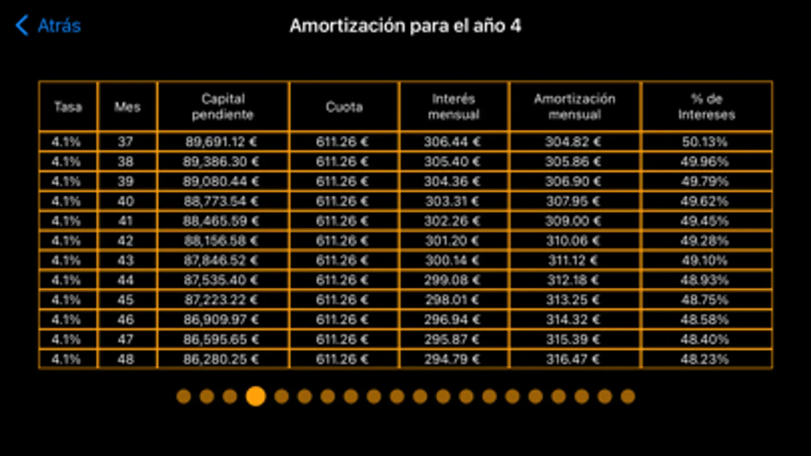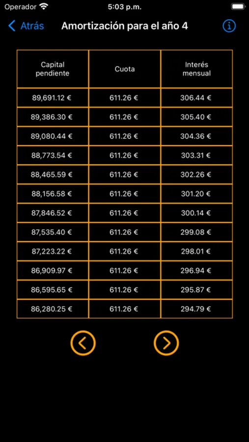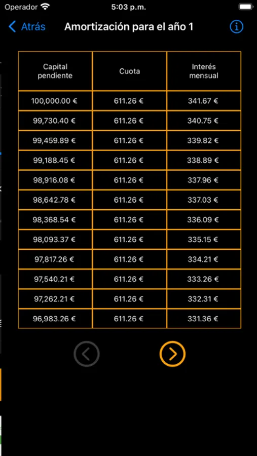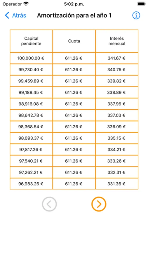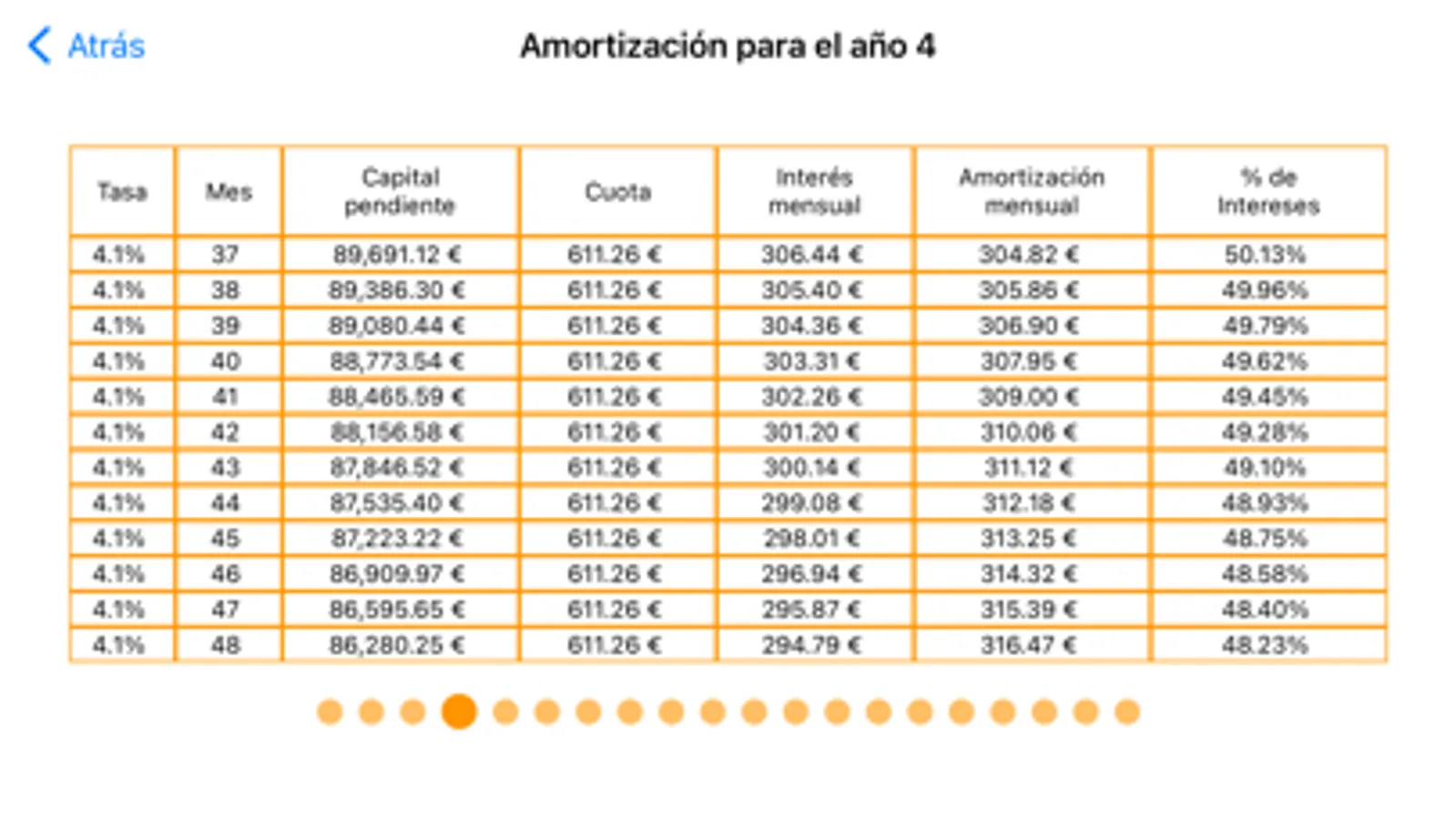 We also show the amortization table year by year in which it is seen how the amount of interest that we have to pay decreases, so it is seen that more and more is amortized.