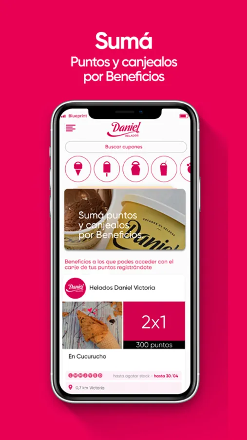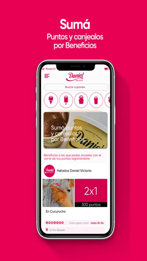 “Aquí cerca” te permitirá ver los cupones cerca tuyo y todas las tiendas de Helados Daniel.
