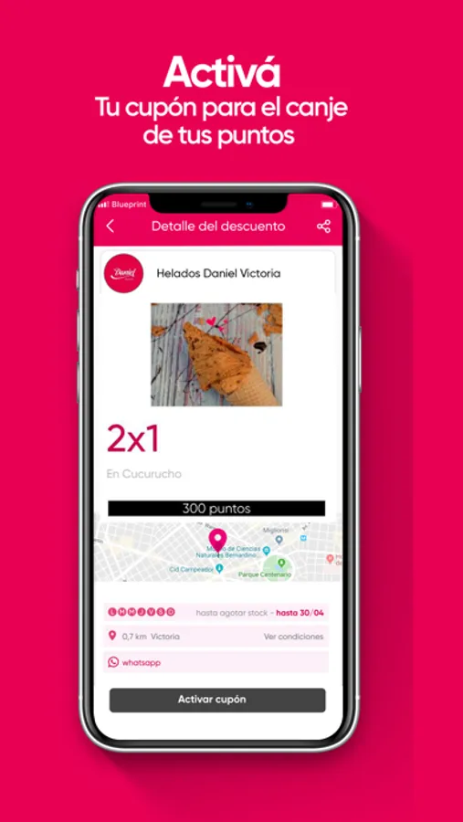 Una vez registrado en la Aplicación vas a poder encontrar los cupones habilitados para el canje indicando los puntos requeridos para el mismo. Luego de activar el cupón podrás acercarte al local para hacer uso del beneficio canjeado.