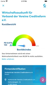 Sie sind noch kein Mitglied bei Creditreform? Kein Problem! Verschaffen Sie sich in der App auch als anonymer oder registrierter Nutzer ein erstes Bild von unserer Daten- und Servicequalität. Wenn es doch etwas mehr sein soll, ist das nächste Upgrade nicht weit entfernt: Als Creditreform Mitglied erhalten Sie Ihren Premium-Zugang zu allen Firmenauskünften, inklusive Bonitätsbewertung und vielen weiteren Online-Services!