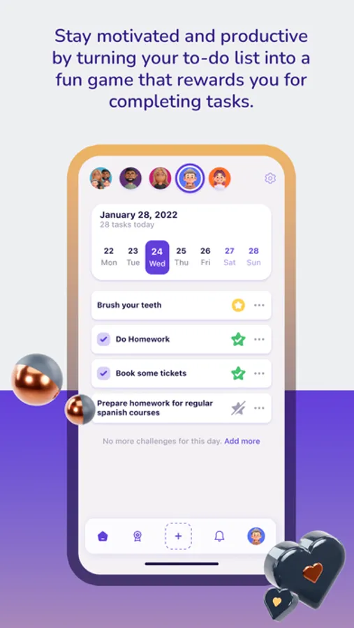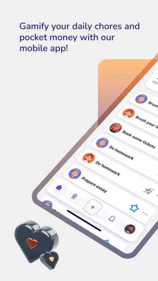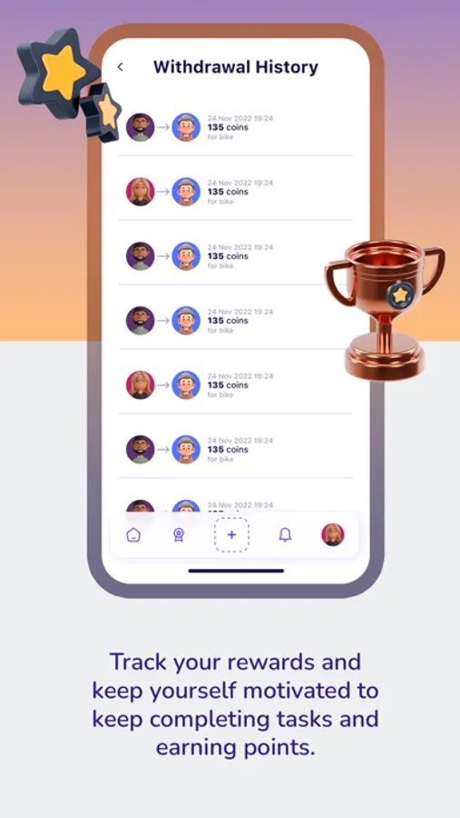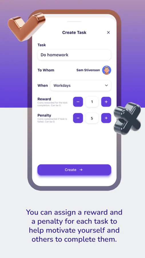 Our app provides a simple to-do list with an easy process of checking off completed tasks. Each task comes with a reward and a penalty. As you complete your tasks, you earn points (coins) that can be redeemed offline for anything you agree upon with other users. Our app makes it easy for you to keep track of your progress and earn rewards for your hard work