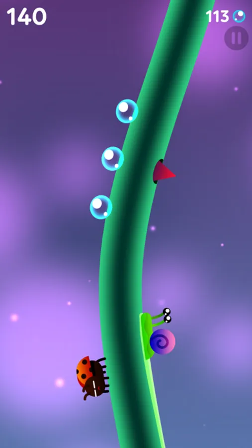 You will become a cute little snail, running non-stop on the vines, collecting bubbles; be careful of the thorns on the vines, ladybugs, etc., tap the screen to switch to the other side of the vines, so as to avoid danger.