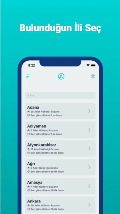 Güncel nöbetçi eczane listesini bulabileceğiniz şehirler: Adana, Adıyaman, Afyonkarahisar, Ağrı, Amasya, Ankara, Antalya, Artvin, Aydın, Balıkesir, Bilecik, Bingöl, Bitlis, Bolu, Burdur, Bursa, Çanakkale, Çankırı, Çorum, Denizli, Diyarbakır, Edirne, Elazığ, Erzincan, Erzurum, Eskişehir, Gaziantep, Giresun, Gümüşhane, Hakkari, Hatay, Isparta, Mersin, Istanbul, Izmir, Kars, Kastamonu, Kayseri, Kırklareli, Kırşehir, Kocaeli, Konya, Kütahya, Malatya, Manisa, Kahramanmaraş, Mardin, Muğla, Muş, Nevşehir, Niğde, Ordu, Rize, Sakarya, Samsun, Siirt, Sinop, Sivas, Tekirdağ, Tokat, Trabzon, Tunceli, Şanlıurfa, Uşak, Van, Yozgat, Zonguldak, Aksaray, Bayburt, Karaman, Kırıkkale, Batman, Şırnak, Bartın, Ardahan, Iğdır, Yalova, Karabük, Kilis, Osmaniye, Düzce, Kıbrıs ve diğer tüm ilçeler