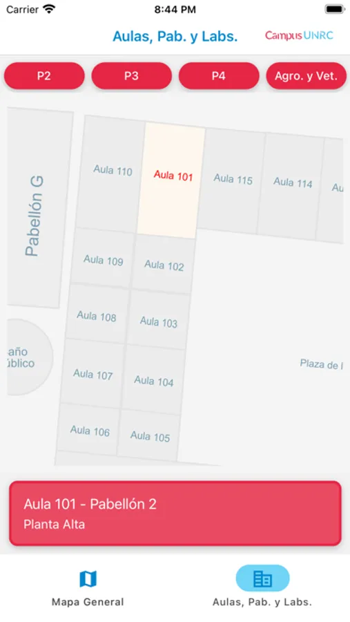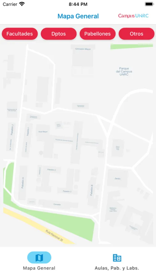 La app "Campus UNRC" es una herramienta diseñada para facilitar la vida de los estudiantes, visitantes y profesores de la univ en su día a día en el campus. Esta aplicación proporciona un mapa interactivo del campus, proporcionado la ubicación de cada aula, pabellón, así como otros lugares de interés.
