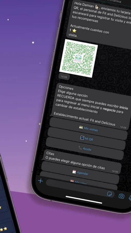 Tus clientes podrán obtener su tarjeta virtual mediante el chatbot, visualizarán sus estrellas por visita e irán obteniendo insignias por nivel de lealtad. Cuando lleguen al objetivo podrán obtener las recompensas que definas y seleccionarla mediante el chatbot.