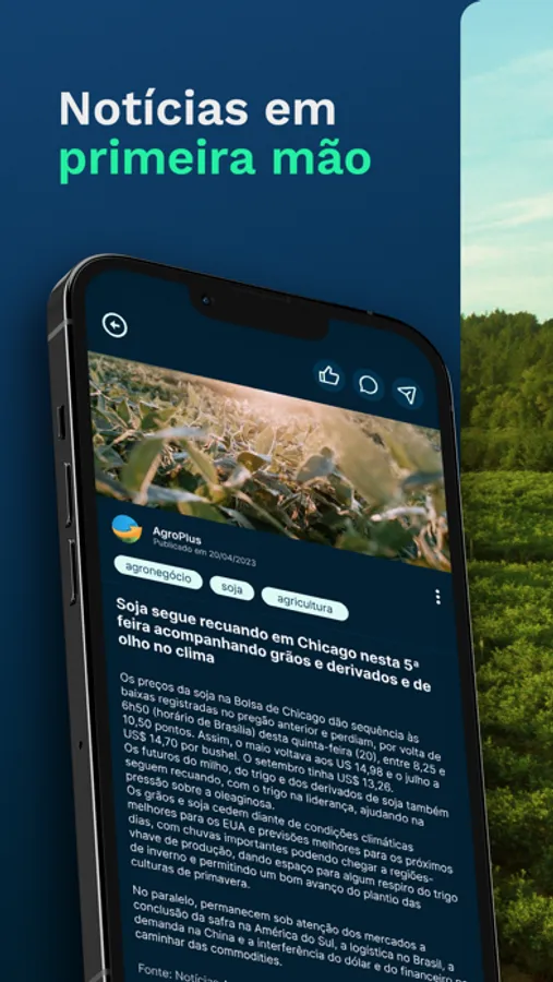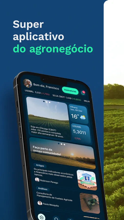 Além disso, o nosso aplicativo também conta com soluções para quem trabalha no agro: Esteja atualizado com as últimas notícias, cotações de mercado (moedas, grão, boi), previsão do tempo com histórico de chuvas, tudo em um só lugar.