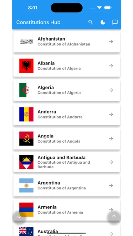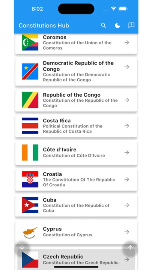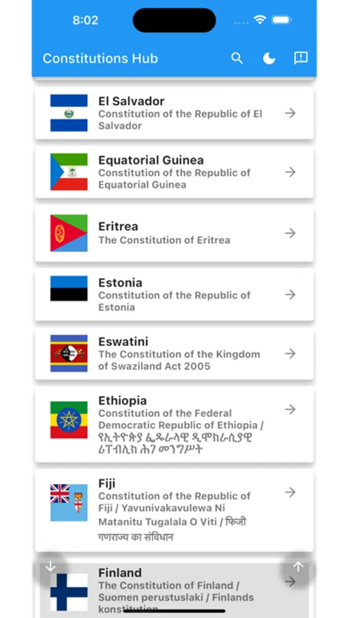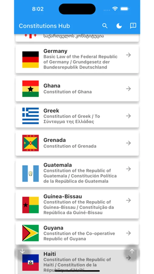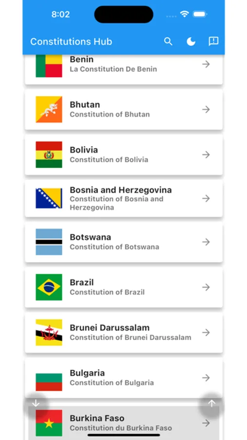 This version contains the constitutions of over 160 countries with all the available translations. This version contains the constitution of Afghanistan, Albania, Algeria, Andorra, Angola, Antigua and Barbuda, Argentina, Armenia, Australia, Austria, Azerbaijan, Bahamas (The), Bahrain, Bangladesh, Barbados, Belarus, Belgium, Belize, Benin, Bhutan, Bolivia (Plurinational State of), Bosnia and Herzegovina, Botswana, Brazil, Brunei Darussalam, Bulgaria, Burkina Faso, Burundi, Cambodia, Cameroon, Canada, Cape Verde, Central African Republic, Chad, Chile, China (People’s Republic of), Colombia, Comoros, Congo (Democratic Republic of the), Congo (Republic of the), Costa Rica, Côte d'Ivoire, Croatia, Cuba, Cyprus, Czech Republic, Denmark 1953, Djibouti, Dominica, Dominican Republic, Ecuador, Egypt, El Salvador, Equatorial Guinea, Eritrea, Estonia, Eswatini, Ethiopia, Fiji, Finland, France, Gabon, Gambia (The), Georgia, Germany, Ghana, Greece, Grenada, Guatemala, Guinea-Bissau, Guyana, Haiti, Honduras, Hungary, Iceland, India, Indonesia, Iran (Islamic Republic of),Iraq, Ireland, Israel, Italy, Jamaica, Japan, Jordan, Kazakhstan, Kenya, Kiribati, Korea (Democratic People's Republic of), Korea (Republic of), Kosovo, Kuwait, Kyrgyzstan, Lao People's Democratic Republic, Latvia, Lebanon, Lesotho, Liberia, Libya, Liechtenstein, Lithuania, Luxembourg, Madagascar, Malawi, Malaysia, Maldives, Malta, Marshall Islands, Mauritania, Mauritius, Mexico, Micronesia (Federated States of), Moldova (Republic of), Monaco, Mongolia, Montenegro, Morocco, Mozambique, Myanmar, Namibia, Nauru, Nepal, Netherlands, New Zealand, Nicaragua, Niger, Nigeria, North Macedonia (Republic of), Norway, Oman, Pakistan, Palau, Palestine, Panama, Papua New Guinea, Paraguay, Peru, Philippines, Poland, Portugal, Qatar, Romania, Russian Federation, Rwanda, Saint Kitts and Nevis, Saint Lucia, Saint Vincent and the Grenadines, Samoa, Sao Tome and Principe, Saudi Arabia, Senegal, Serbia, Seychelles, Sierra Leone, Singapore, Slovakia, Slovenia, Solomon Islands, Somalia, South Africa, South Sudan, Spain ,Zambia, Zimbabwe. What is so unique is that this application also contains various translations of the constitutions of over 83 countries with more to come. Future updates will include all the countries of the world constitution.