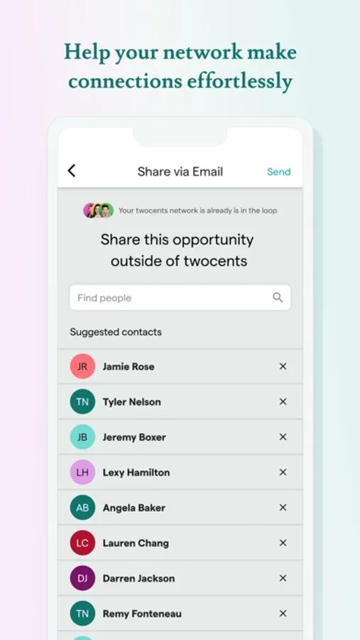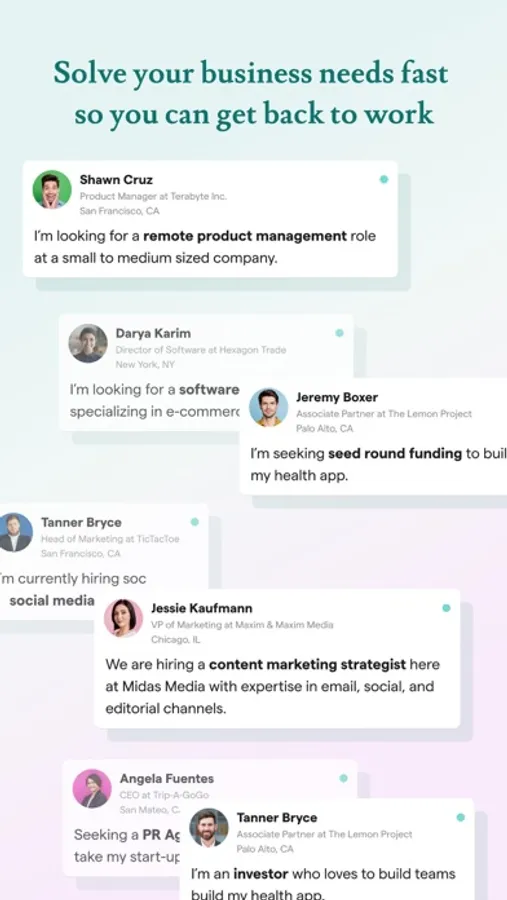Twocents is a brand new network designed to make you more efficient at work. Quickly find connections who can help you solve business problems, and move on with your day. Hire, fundraise, find agencies, invest, find a job or discover the latest software tools. All through a network of real decision makers, connecting without spam or fluff.