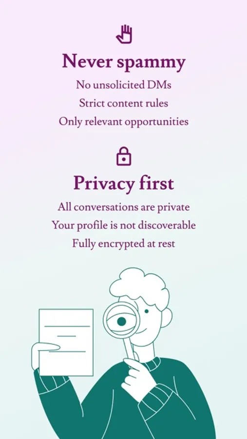 We are privacy-first. All conversations are private, and you are not discoverable on our platform. Only engage in conversations you want to be a part of.