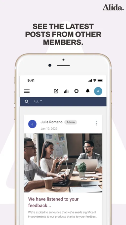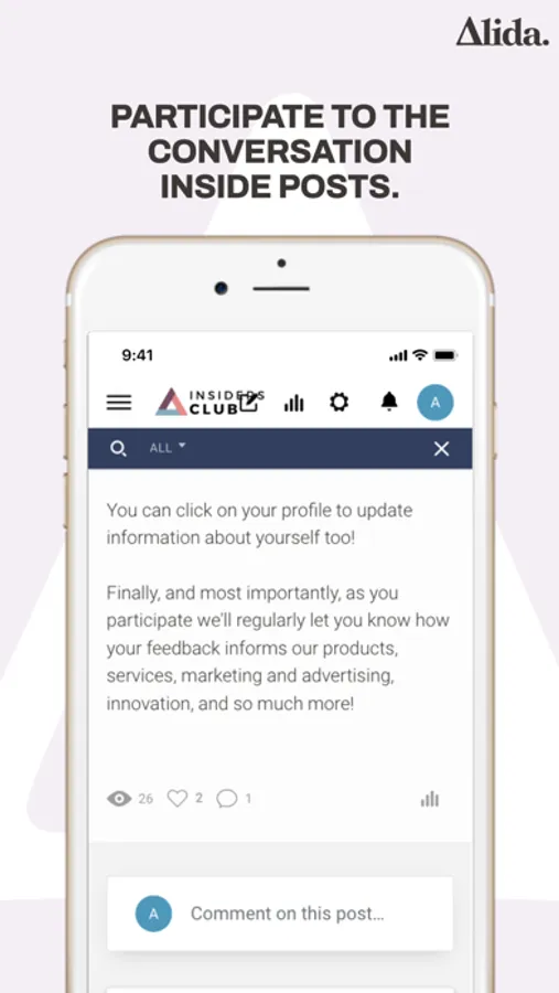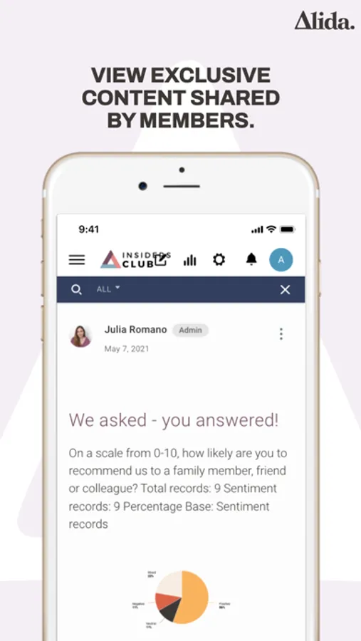 The app enables users to sign in to their Alida community and engage in the community member hubs, various topic forums and allows members to participate in surveys - all from within the app.