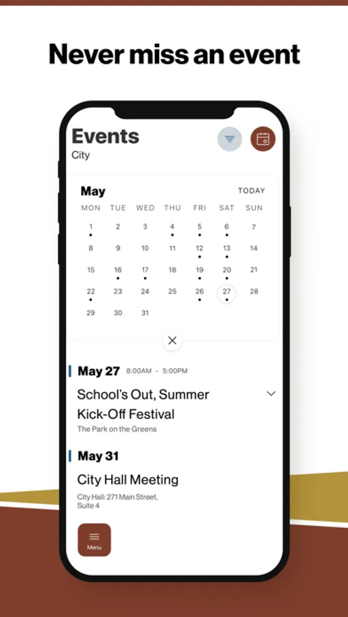 The event section shows a list of events throughout our community. Easily add an event to your own calendar and/or share the event with friends and family with one tap.