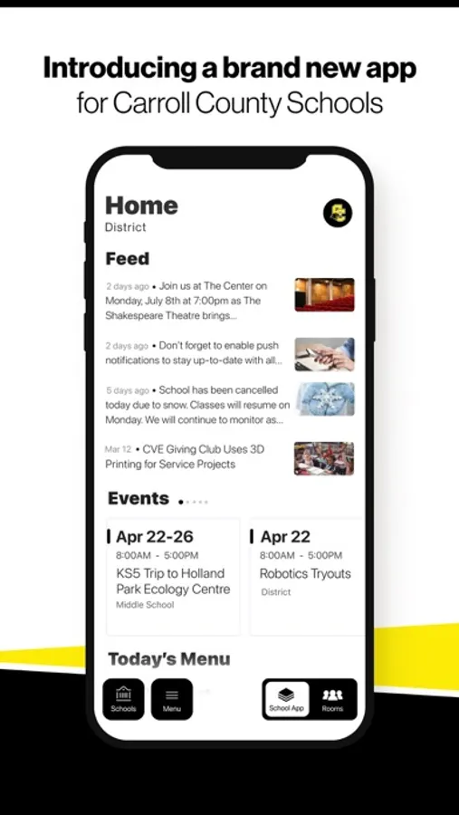 The event section shows a list of events throughout the district. Users can add an event to their calendar to share the event with friends and family with one tap.