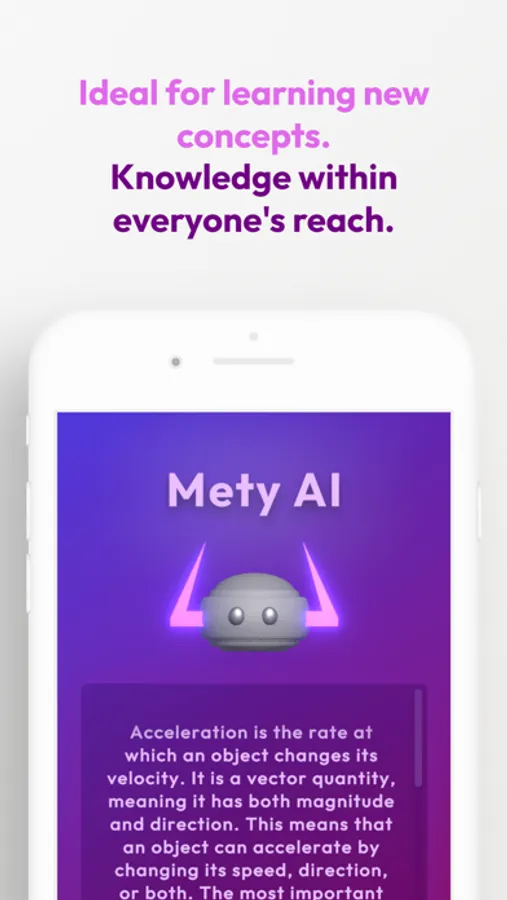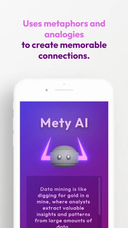 Mety AI is a mobile application that uses a cutting-edge Artificial Intelligence that employs metaphors and analogies to make learning more interesting and accessible to everyone. With its ability to explain complex concepts in an understandable way, Mety is an essential tool for students, teachers, researchers, and anyone willing to learn.