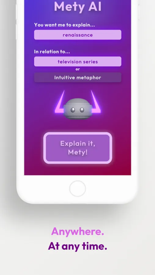 Mety is capable of explaining any conceivable concept, relating them to any field of knowledge such as football, music, historical events, or famous movies, among many others. You can use Mety to understand more quickly, learn something new, or compare concepts. Additionally, in its Premium version, Mety offers explanations in different styles, from clear and direct to poetic or humorous.