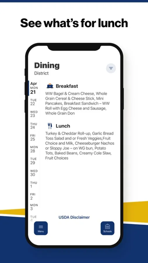 Within the dining section, you'll find an easy to navigate, weekly menu, sorted by day and meal type.