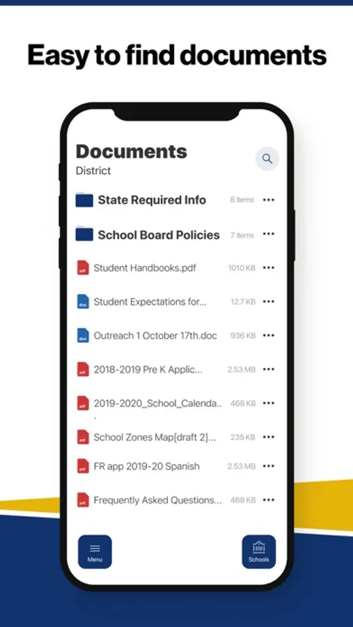 The event section shows a list of events throughout the district. Users can add an event to their calendar to share the event with friends and family with one tap.